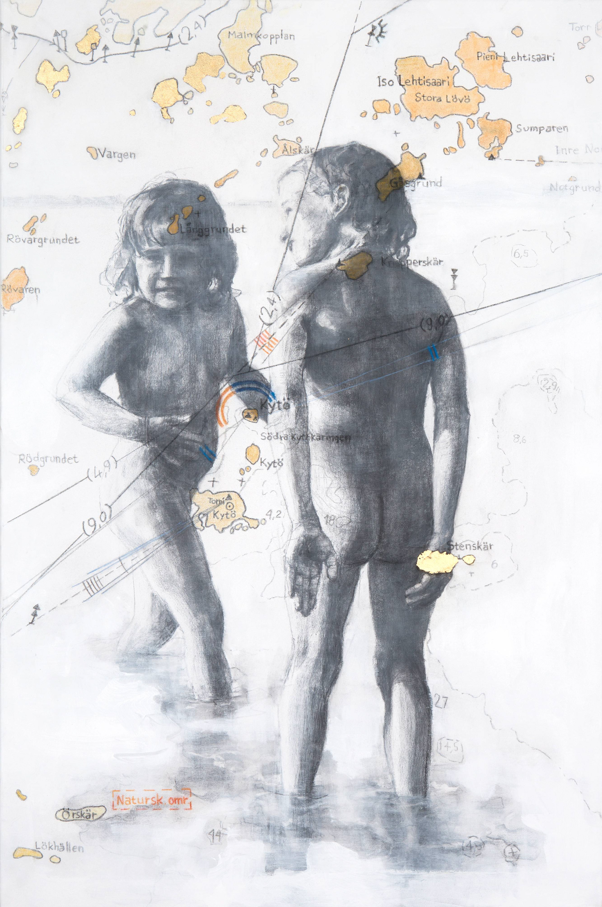 Lövö. Charcoal, acrylic, foil gold and pastel on canvas, 100x80 cm. 2014